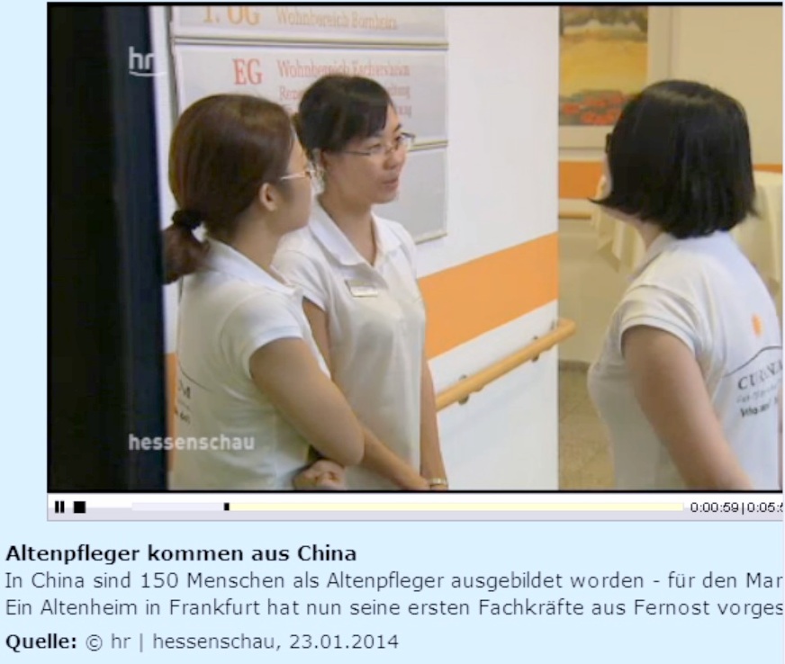2012年德国到中国招聘了150名专业护理。自2014年初起这150名中国护理人员将陆续达到德国,主要在黑森州、汉堡、巴符州等地工作。1月22日,中国第一批5名护理人员抵达德国已开始在法兰克福Curanum养老院工作。