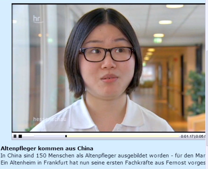 秦志红是第一批到德国的护理人员中的有一位。她从1月22日起在法兰克福养老院参加一个试点性项目。为了避免沟通出现问题,秦志红在中国的时候就取了这个外文名字。在中国她已经完成了8个月的德语教程。秦女士微笑着说道,她学的第一句德语是“您好”。在回答为什么选择来到德国的问题时,她笑着回答:“清新的空气、优美的环境,一切都不一样。”当记者问到中国和德国的区别时她说:“一切都很不同。”比如在中国,如果年迈的爸妈失去了自理能力,儿女们有义务照顾父母。德国却完全不同。
